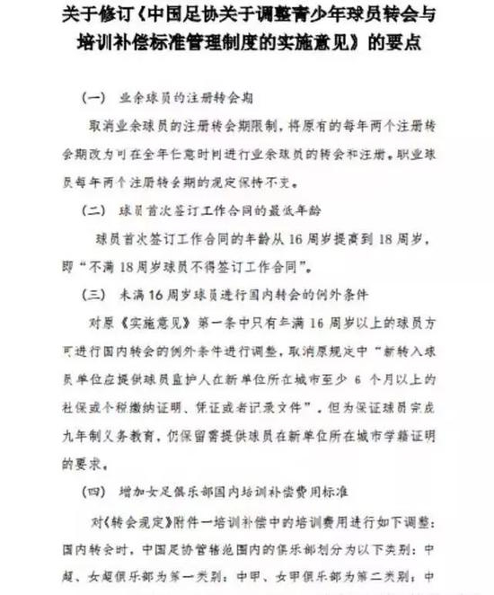 近日,中国足协对注册系统进行修改和培训,对《中国足协关于调整青少年球员转会与培训补偿标准管理制度的实施意见》进行了修订。