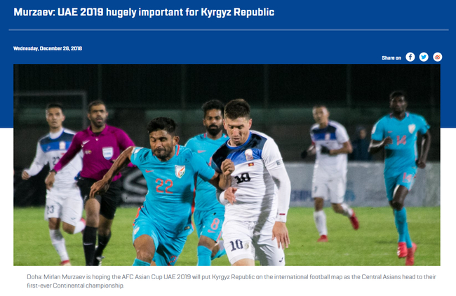 明年1月初,2019年亚洲杯即将在阿联酋打响,国足与吉尔吉斯斯坦、菲律宾和韩国分在同一小组。日前,亚足联官网采访了吉尔吉斯斯坦前锋穆尔扎耶夫。本次亚洲杯是吉尔吉斯斯坦历史上首次进入正赛,对于如此重要的比赛,穆尔扎耶夫也发表了自己的看法。