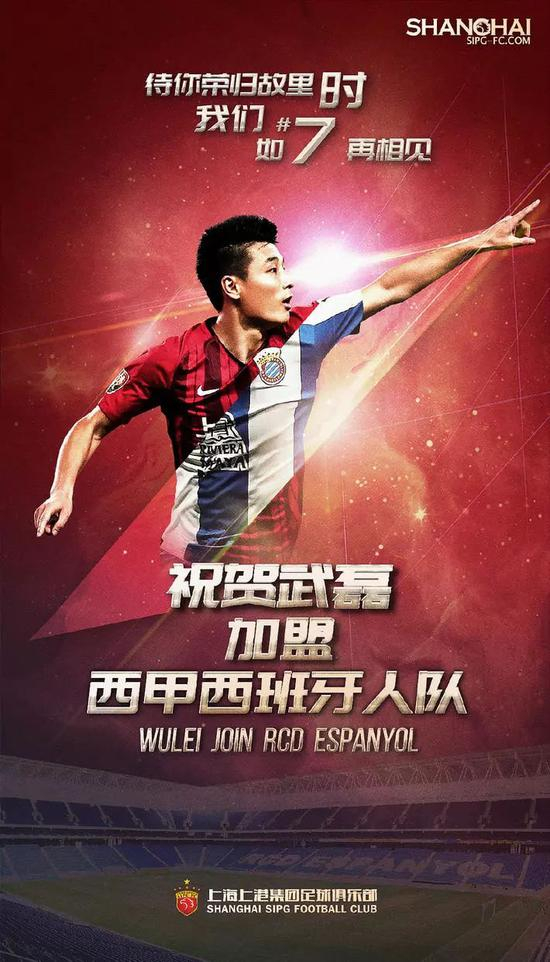 1月28日,上海上港官方宣布武磊加盟西甲西班牙人。上港向武磊依依惜别珍重,祝愿武磊在全新的环境里工作顺利、继续进步;也希望他能够在足球强国和高水平联赛中得到更好的历练与提升。