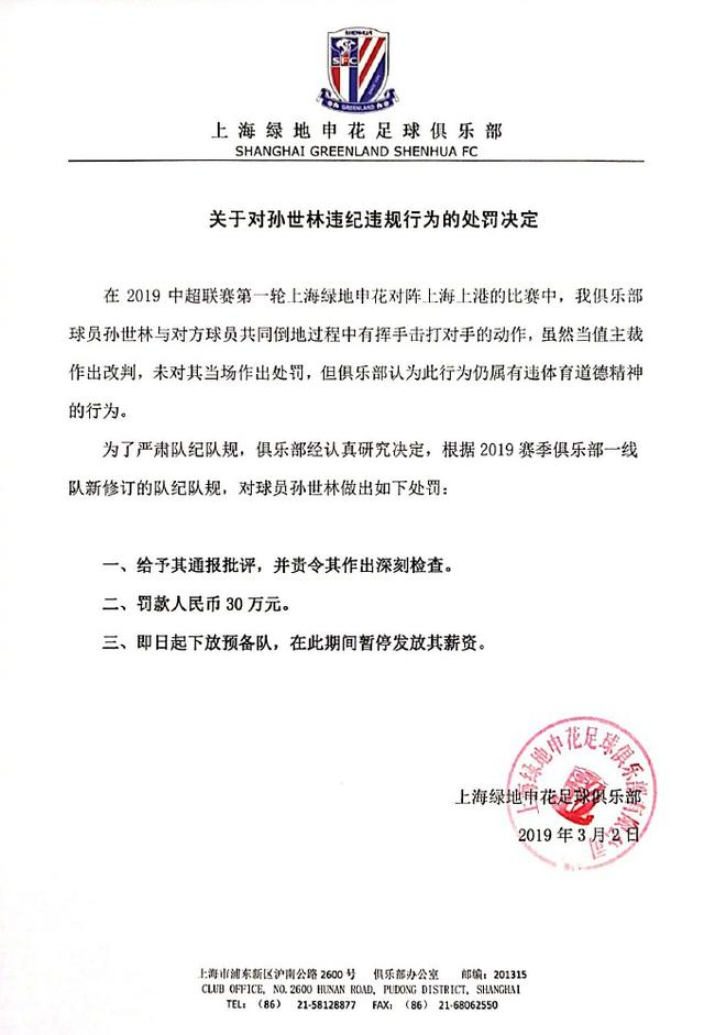孙世林遭到申花重罚