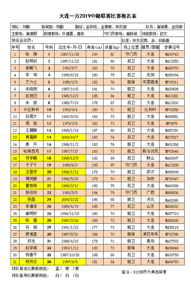 2019赛季大连一方报名表。