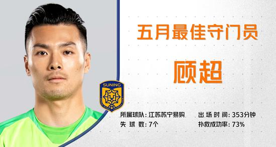 顾超在五月份代表江苏苏宁易购出场全部四场比赛,作为苏宁后防的最后一道铁闸,顾超功不可没。凭借着自己迅捷的反应能力以及准确的预判,一次次将对手的必进之球拒之门外,顾超五月份场均评分7.07分,扑救成功率达到73%,顾超无疑是球队最值得信赖的最后防线。最终,顾超以44252票的总得票数力压王大雷、荣获中超联赛5月最佳守门员。