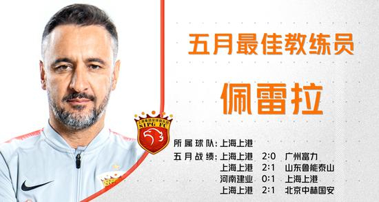 五月佩雷拉率领上海上港取得四战全胜的战绩,进7球失2球。在队中仍然面临严峻伤病的情况下,佩雷拉带领球队以顽强的意志和合理的轮换渡过难关,特别是主场接连以2-1的比分力克鲁能和国安两大强敌,含金量十足。靠着五月的出色发挥,球队在积分榜上也将与“领头羊”北京中赫国安之间的差距缩小至2分,卫冕冠军依然是本赛季联赛冠军的有力争夺者。最终,佩雷拉以46760票力压鲁能主帅李霄鹏和国安主帅施密特,成功当选五月月度最佳教练员。