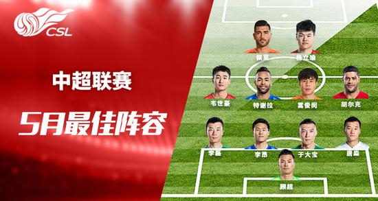 随着各个最佳奖项的出炉,5月月度最佳阵容也随之而出,本次最佳阵容依旧沿用4-4-2阵型。其中,获得5月月度最佳守门员的江苏苏宁易购门将顾超、以及月度最佳球员的胡尔克自动入选月度最佳阵容;根据官方评分系统,最终按照得分的高低顺序决出9名球员进入最佳阵容,5月月度最佳阵容名单如下: