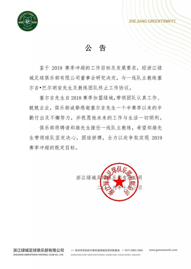 北京时间7月3日,中甲球队杭州绿城官方宣布,与主教练塞尔吉及其团队终止合同,郑雄将出任球队主帅。