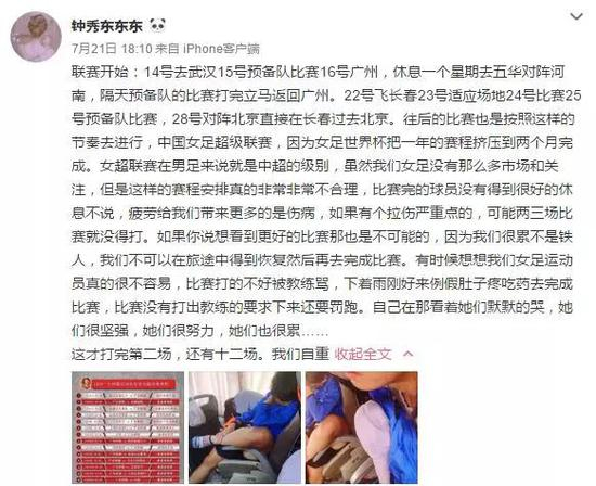 战绩惨淡还是其次,球员在炎热夏季密集赛程的煎熬才更加让人心酸。广东女足的主力中场钟秀东在第二轮赛后在微博发表长文大吐苦水:“女超联赛在男足来说就是中超的级别,虽然我们女足没有那么多市场和关注,但是这样的赛程安排真的非常非常不合理,比赛完的球员没有得到很好的休息不说,疲劳给我们带来更多的是伤病,如果有个拉伤严重点的,可能两三场比赛就没得打。如果你说想看到更好的比赛那也是不可能的,因为我们很累不是铁人……”钟秀东的吐槽道出了女超联赛安排的不专业。