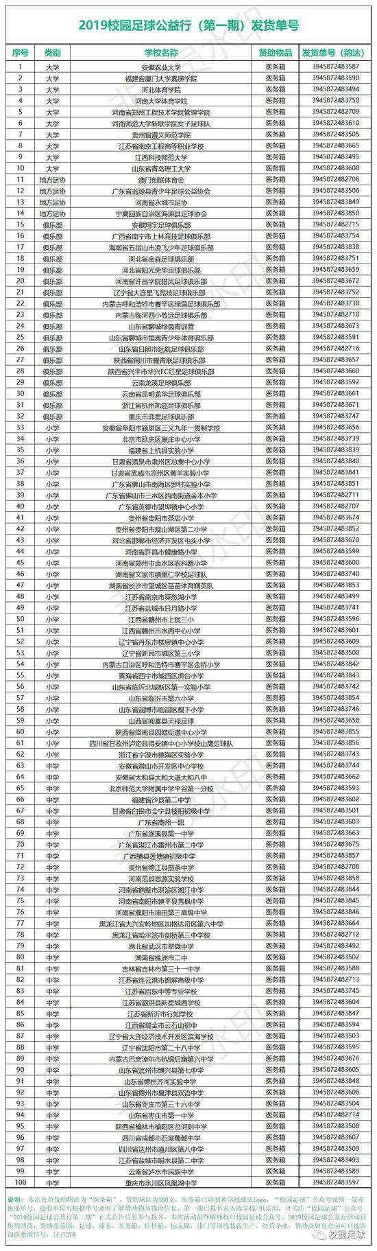 本次公益赞助物品为“医务箱”,赞助球队为100支,医务箱已印制各学校球队logo,“校园足球”公众号现发布快递单号,接收单位可根据单号及时查询赞助物品物流信息。第一期已报名未入选学校/俱乐部,可关注“校园足球”公众号“2019校园足球公益行第二期”正式公告信息参与报名。本次活动最终解释权归校园足球公众号。2019校园足球公益行活动征集赞助商,赞助商范围:足球、球衣、医务箱、拉杆箱、标志碟、球门等训练装备生产、经营企业。赞助商如有意向可直接咨询联系微信号:lfj7276