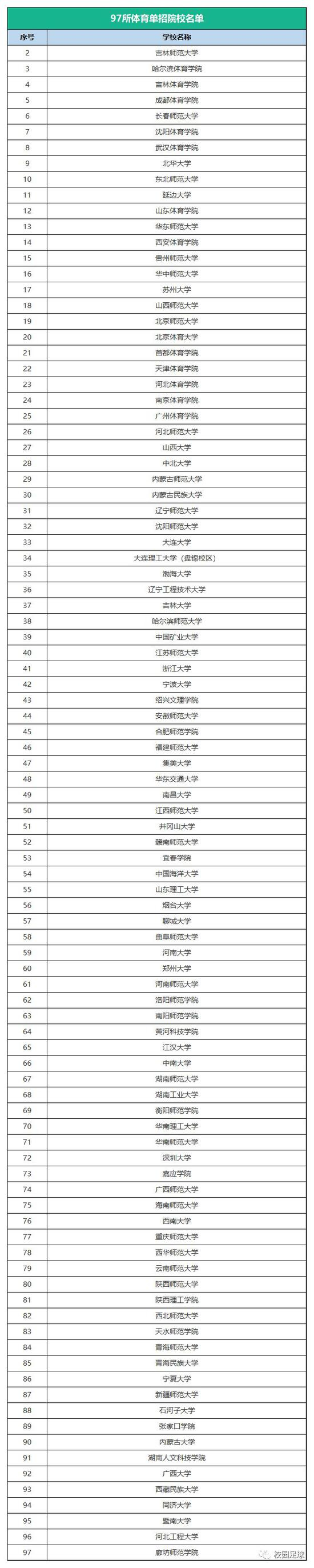 二、97所体育单招院校名单
