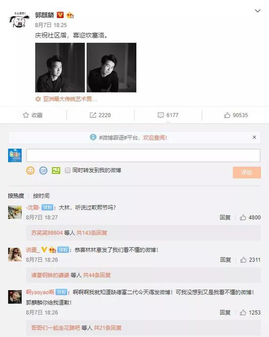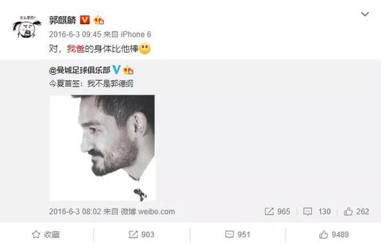 郭德纲大儿子郭麒麟是曼城的球迷,即便是七夕节,大林的微博依然是“庆祝社区盾,喜迎坎塞洛”,让一群女粉丝摸不着头脑。