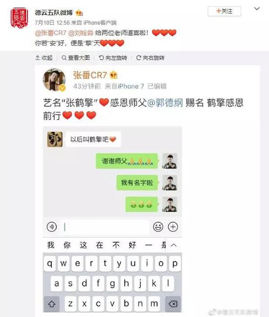 郭德纲新收的弟子张番如今得名张鹤擎。在得名之前,张鹤擎的微博名字是张番CR7,他是一位不折不扣的C罗铁粉。