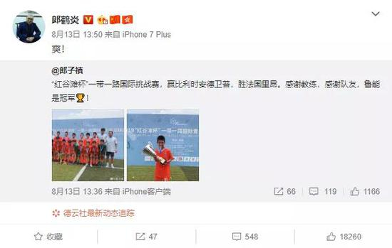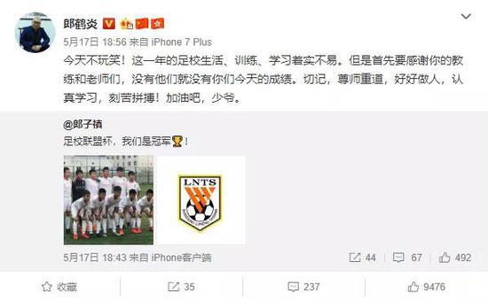 张鹤伦的搭档郎鹤炎不仅是位球迷,他儿子还是一名小球员,目前在鲁能的青训踢球。在“红谷滩杯”挑战赛中,郎鹤炎儿子郎子禛就随鲁能一起赢得冠军。