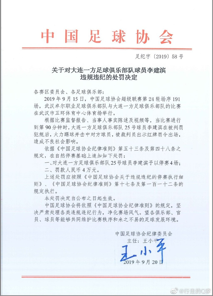 北京时间9月20日,足协官方发布公告,就第24轮一方队员李建滨闷人动作处以罚款4万,停赛4场的处罚。