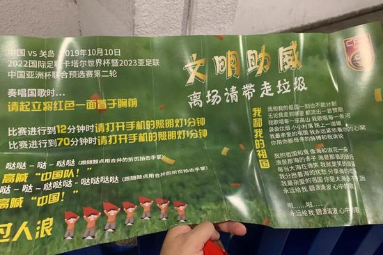 19时05分,球迷区,很多入场时没有身着红色助威服的球迷,会被保安和志愿者赠送一件恒大集团特供的、许家印同款“中国”红杉,以及一份助威指南,指导如何呐喊和欢呼。
