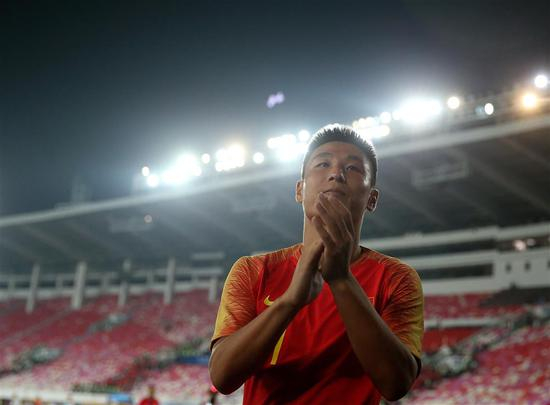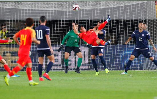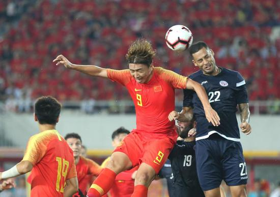 图说:半场比赛结束前,吴曦再头球破门,国足6-0领先关岛进入下半场。