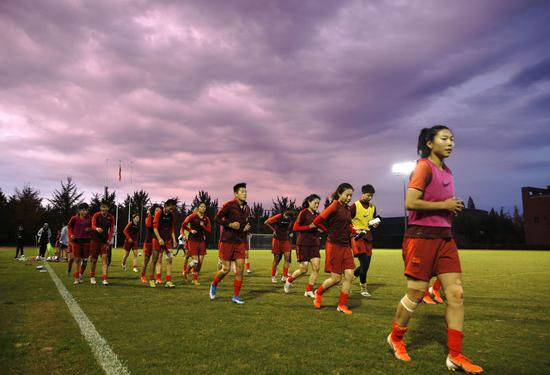 10月24日,中国女足球员在训练后慢跑。近期,中国国家女子足球队在香河国家足球训练基地进行第二阶段集训,备战11月在重庆举行的永川四国赛,以及明年2月份开始的东京奥运会预选赛。新华社记者 丁旭 摄