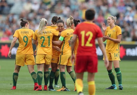 2017年11月26日,澳大利亚队庆祝进球。当日,在澳大利亚墨尔本进行的女足国际友谊赛中,澳大利亚队主场以5比1战胜中国女足,取得对阵中国女足的两连胜。新华社记者白雪飞摄