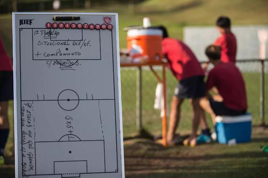 在巴西圣保罗州鲁能巴西体育中心拍摄的山东鲁能U16队训练战术板。新华社记者李明摄