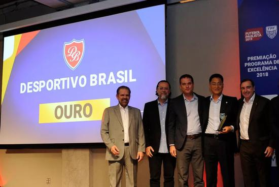 鲁能巴西体育中心获得巴西圣保罗州职业俱乐部优秀青训金奖,圣保罗州足协主席巴斯托斯(左一)颁奖。鲁能巴西体育中心供图