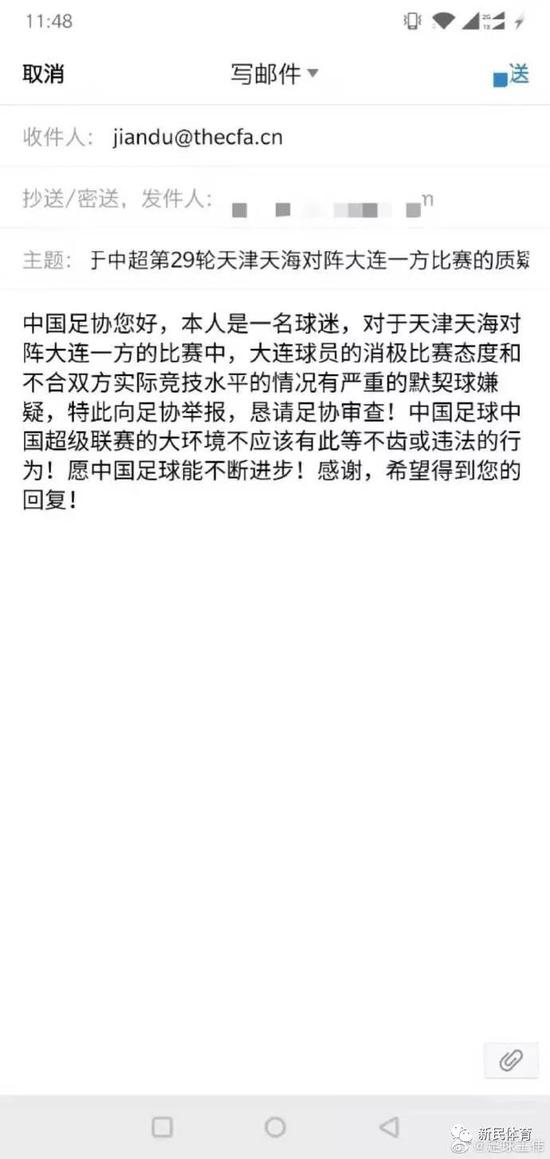 这下,一方球迷跳了起来。赛后,球迷直接给中国足协官方邮箱发去邮件,恳请足协审查比赛是否存在默契球嫌疑。邮件收到足协官方邮箱的自动回复:你好,来信已收到。