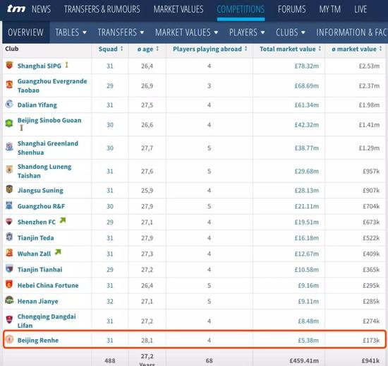 转会市场网站数据,中超联赛球员总身价高居亚洲第一