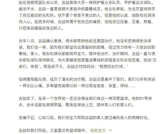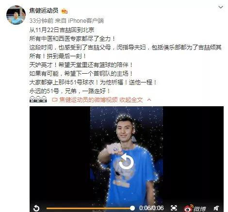 “从11月22日吉喆回到北京,所有中医和西医专家都尽了全力!这段时间,也感受到了吉喆父母,闵指导夫妇,包括俱乐部都为了吉喆倾其所有!拼到最后一刻!天妒英才!希望天堂里还有篮球的陪伴!如果有可能,希望下一个首钢队的主场,大家都穿上那件51号球衣!为他祈福!送他一程!永远的51号,兄弟,一路走好!”