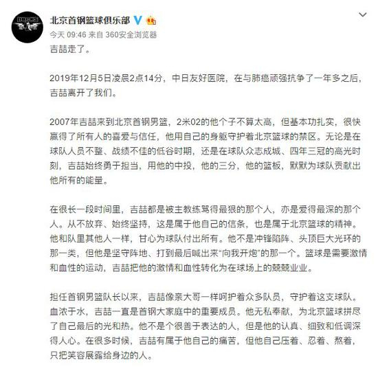 随后北京首钢篮球俱乐部官方微博发布消息称2019年12月5日凌晨2点14分,中日友好医院,在与肺癌顽强抗争了一年多之后,吉喆离开了我们。