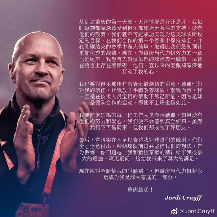 记者鲁蜜报道 12月14日晚,重庆斯威官方发布消息,表示约尔迪·克鲁伊夫先生将不再担任重庆斯威足球队主教练职务。随后,小克鲁伊夫个人微博也发文,表达了对重庆斯威俱乐部、重庆球迷、球员以及俱乐部工作人员的感谢。至此,双方和平分手。