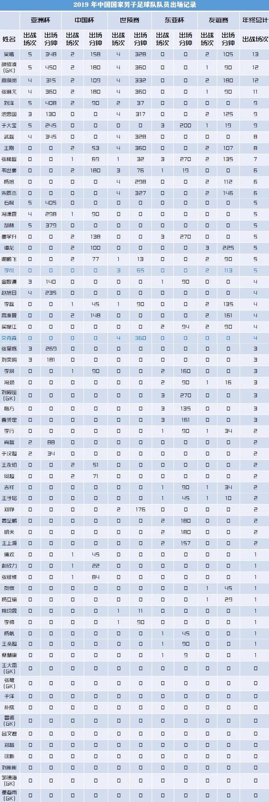 2019 年度,中国男足国脚出勤率统计 数据来源:德国《转会市场》网站