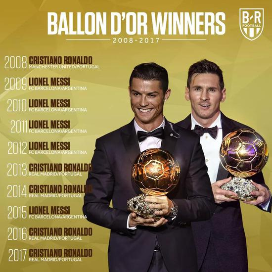 2017年,C罗再次赢得金球奖。从2008-2017,绝代双骄垄断世界足坛,各拿5座金球!这是一个群星璀璨的十年,更是一个双月同天的十年!