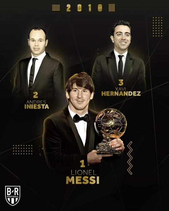 2010年,国际足联世界足球先生与《法国足球》金球奖合并后的首届FIFA金球奖,属于巴萨,属于拉玛西亚,梅西、哈维、伊涅斯塔进入前三,梅西成功卫冕。
