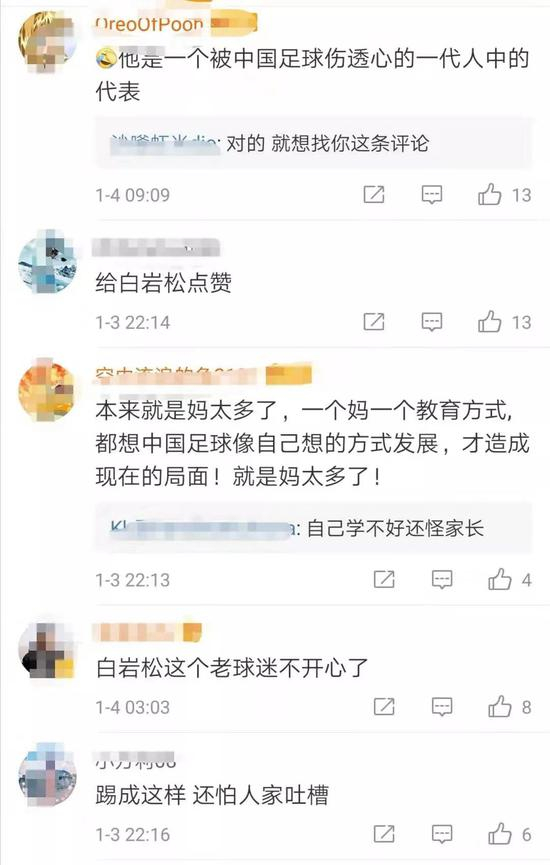 白老师评论中国足球的“金句”不胜枚举,以上只是冰山一角。俗话说“爱之深,责之切”,其实除了像白岩松这样的公众人物意外,很多球迷都会在国足输球后毫不留情地送上自己的“嘲讽”,不过球迷们对国足的爱也是真真切切的。