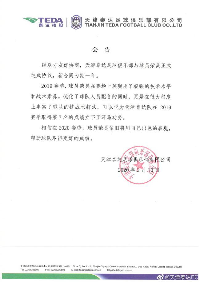 经双方友好协商,天津泰达足球俱乐部与球员荣昊正式达成协议,新合同为期一年。
