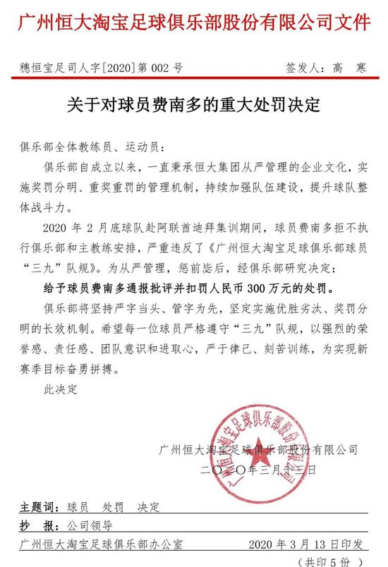 此后数年,阿兰、冯潇霆、韦世豪等都因为各种原因遭到过恒大的队内严罚。而这次针对费南多的罚单,是集团董事局主席许家印亲自勒令,相比曾经孔卡的更为严厉,罚金高达300万,为队史第一罚单,也是中国足球职业联赛27年历史上最重的一张俱乐部内部罚单。
