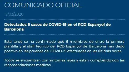 北京时间18日,西班牙人俱乐部曾官方宣布,共有6位一线队成员新冠病毒检测呈阳性,所有人均为轻症,并遵循医嘱进行治疗。西班牙人俱乐部随即进行了关于新型冠状病毒疫情危机委员会第二次会议,宣布暂停一线队在纳瓦塔的集训。