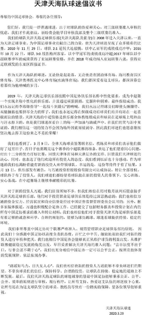 晚间,一封以 “天津天海球迷” 名义发布的公开倡议书在网上迅速流传,在这封发给中国足协的倡议书中,天海球迷恳请 “中国足协能够秉持公正、公平、公开、效率的原则进行审核,履行程序,让所有的球迷、球员、教练尽快有一份踏实的保障” 。作为天海教练组组长,李玮锋转发了该条倡议书并写道: “感谢天津球迷们的支持,谢谢大家一路与我们这支队伍同在。我们和大家一样在等待准入的消息,期待新赛季,全新的我们,一定用好的表现回报大家。”