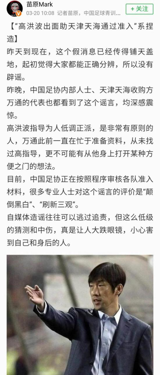但这一消息随后引发多方记者的辩论,有记者直言这就是个假消息,并表示足协内部非常震惊,天津天海收购方万通的代表也都看到了这个谣言,对这个谣言的评价是 “颠倒黑白” 、 “刷新三观” 。