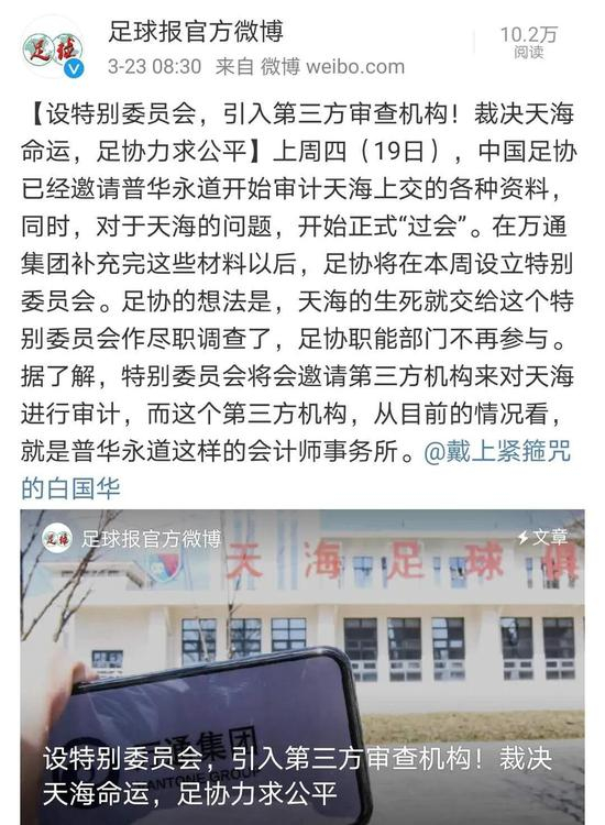 不过随后,新浪体育报道称,中国足协内部人士对此事并不知情,也不存在特别委员会和第三方机构。此外,普华永道会计师事务所也表示,没有接到足协委托审计天海俱乐部财务的通知。