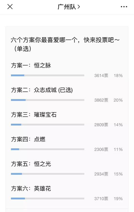 而截止到目前为止,恒大集团官方微信公众号展开的新建球场投票,6个方案在得票百分比上并没有拉开很大的差距,方案一:恒之脉与方案五:恒之光暂时领先,但最高的24%,最低的11%,其他也是百分之十几,并没有拉开。然而“广州队”微信公众号的投票结果情况类似,6个方案在得票百分比上同样没有被拉开……请还没有投的朋友继续投票,你的意向将极有可能左右未来恒大足球场的造型。