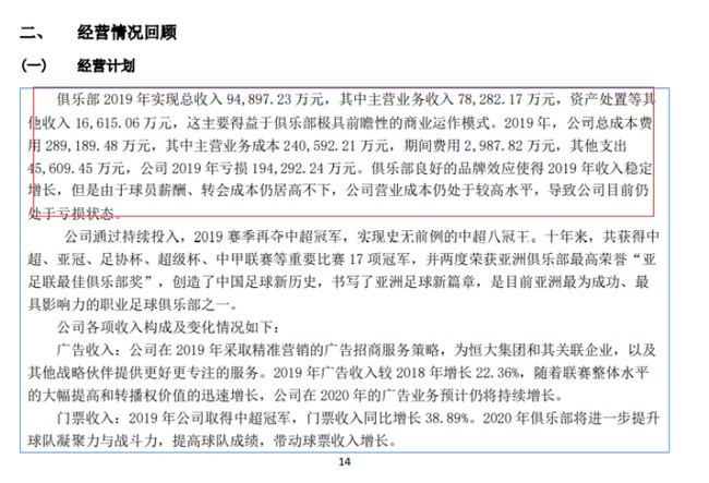 恒大方面表示,虽然2019年收入稳步增长,但因为球员薪酬、转会费的居高不下,导致运营成本依旧处在较高水平,俱乐部依旧处于亏损状态。