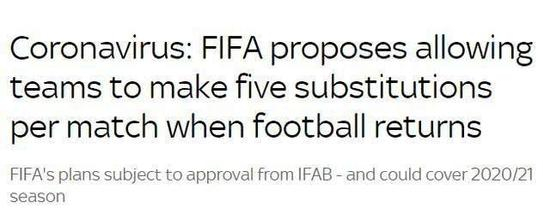 根据英国《天空体育》的消息:受到新冠肺炎疫情影响,全球大部分足球比赛已经暂停。考虑到一旦比赛陆续恢复,密集的赛程将增加球员受伤的风险,国际足联提议在90分钟内各队可以拥有五个换人名额。