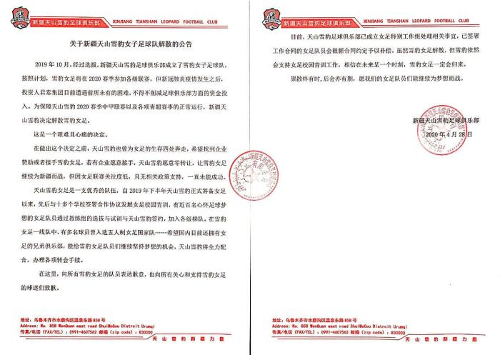 由于各种原因,投资人不得不削减足球俱乐部方面的资金投入。为保障天山雪豹男足2020赛季中甲联赛以及各项青超赛事的正常运行,俱乐部决定解散雪豹女足,这也让这支球队存在的时间定格在了7个月。