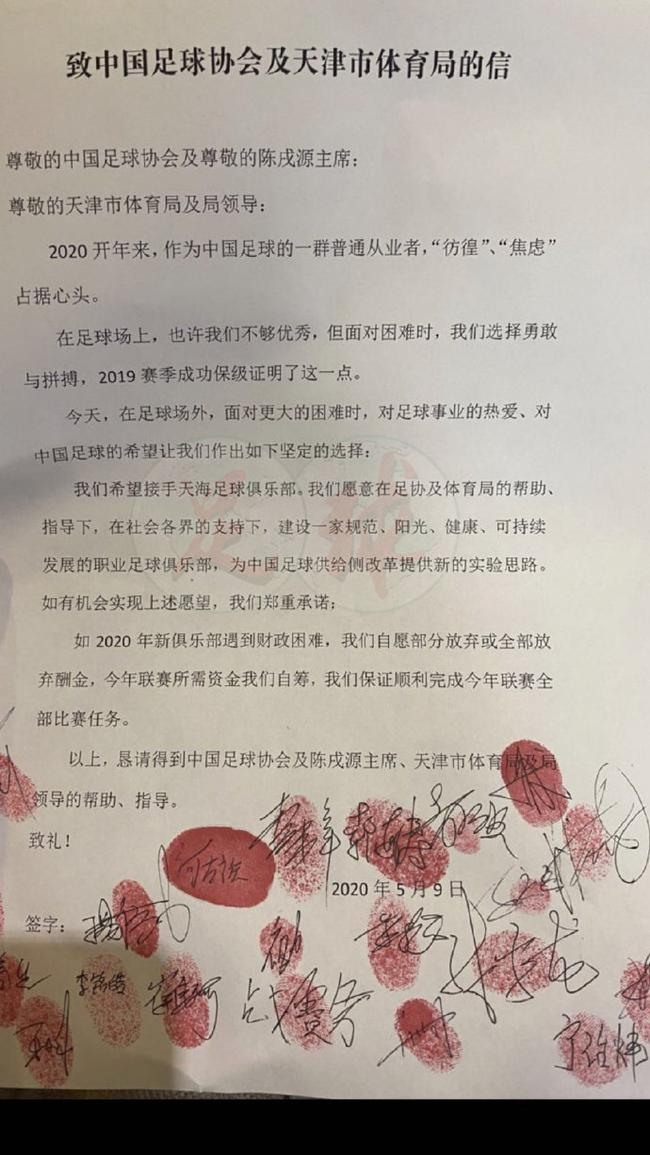 以上,恳请得到中国足球协会及陈戌源主席、天津市体育局领导的帮助、指导。