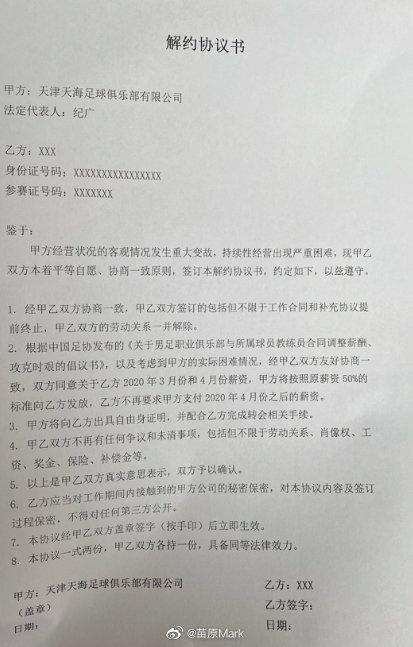 北京时间5月21日消息,据记者苗原微博透露,天津天海俱乐部拿出了一份解约协议书要求球员签字,解约协议书要求球员必须接受降薪50%+放弃5月工资才给发钱。