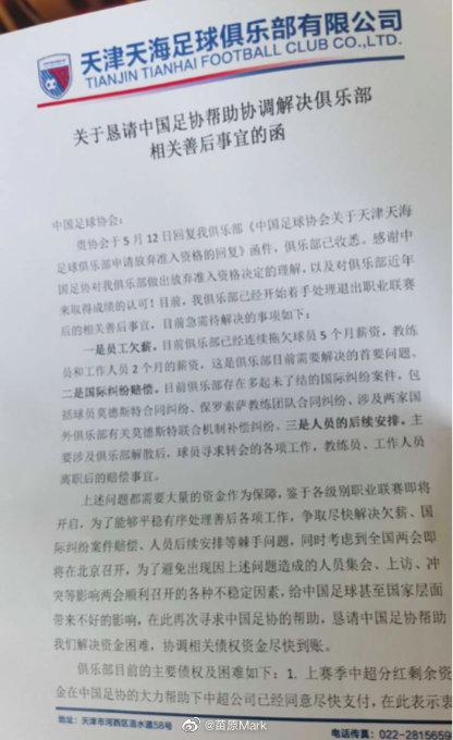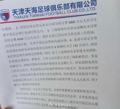 北京时间5月21日消息,据记者苗原微博透露,天津天海上周曾致函中国足协,希望足协帮忙协调、退还总计2亿元的费用。
