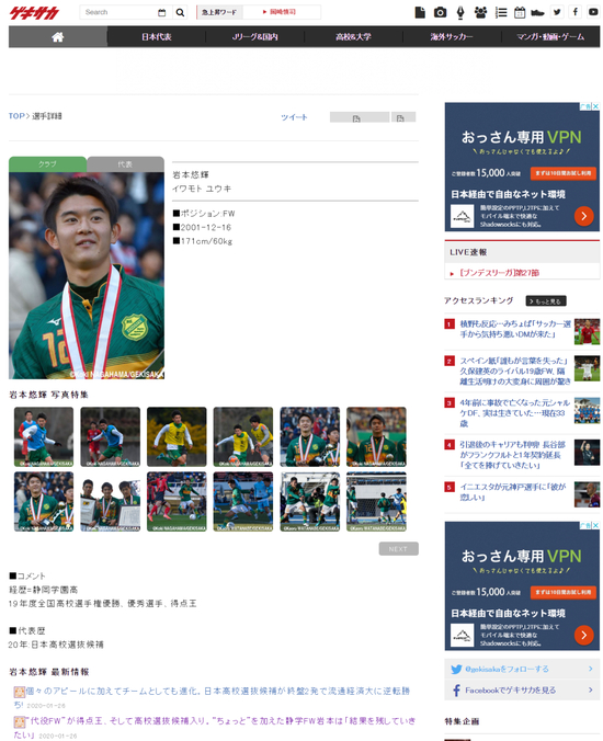 《ゲキサカ》网站的高中球员资料页