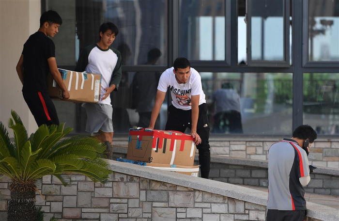 图说:5月12日,天津天海俱乐部球员搬运行李,准备离去。