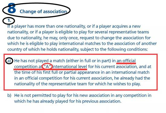 在国际足联章程“8.1.a)”中规定得很明确,只要没有代表某协会代表队参加过国际足联或洲际足联组织的正式大赛(如世界杯、美洲杯、亚洲杯、欧洲杯、中北美洲及加勒比地区金杯赛、非洲国家杯赛等这些属于国际A级赛赛事),哪怕是那些代表原协会出场参加过国际A级赛热身赛的球员,也都有权力选择代表队。当然,前提是需要具备国际足联章程中所提及的资格。