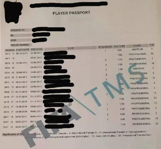 国际足联TMS系统中的球员护照(样本)
