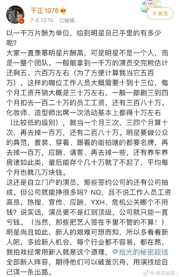 7月6日,于正发微博就再度兴起的“演员片酬过高”话题,反怼网友、替演员声援,结果惨烈翻车,大遭网友群嘲猛打,惹得于正失了声,也不见娱乐圈其他人士胆敢出气。