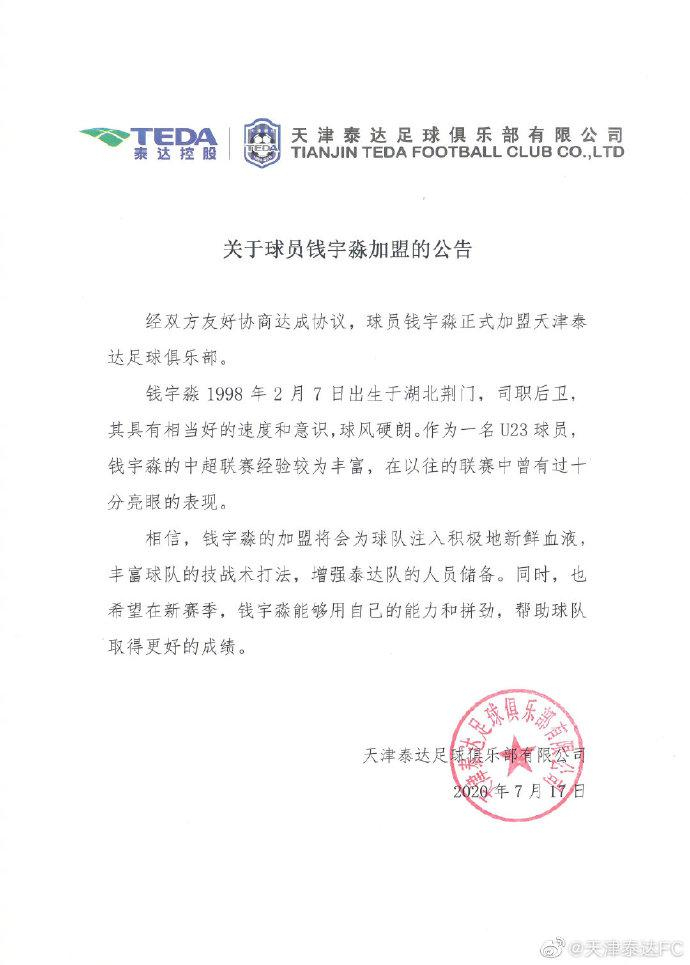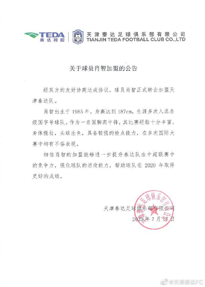 北京时间7月17日,天津泰达官方宣布,国脚中锋肖智与前天海U23后卫钱宇淼正式加盟。